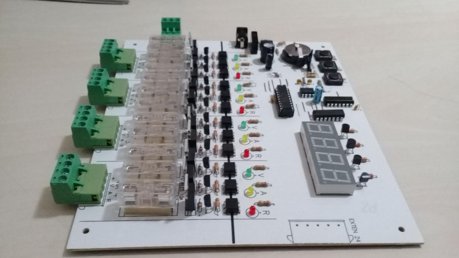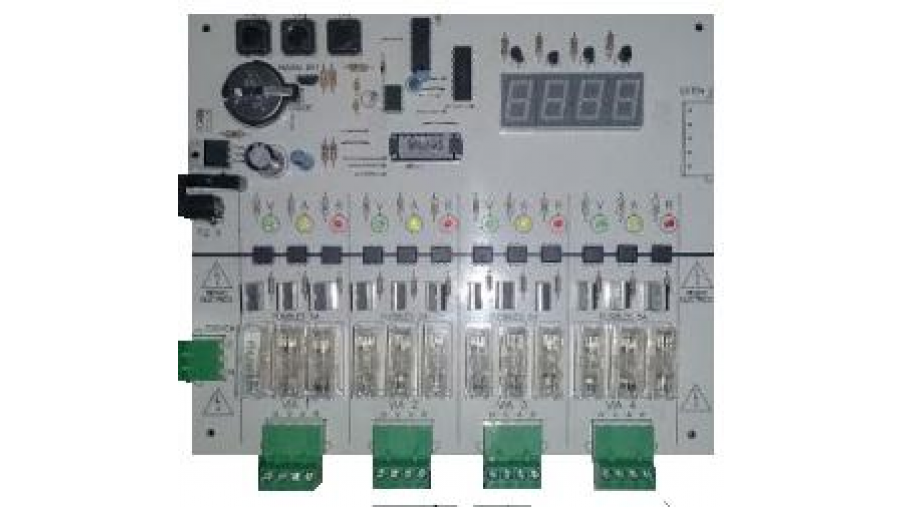 CONTROLADOR DE TRÁNSITO DE 4 VÍAS QUE PERMITE REGULAR LOS TIEMPOS DE LOS SEMÁFORO DE 4 VÍAS. TAMBIÉN LOS INTERMITENTES AMARILLOS.
