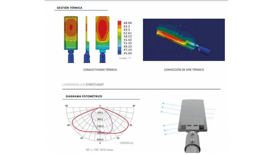 Carcaza inyectada en aluminio 6030 de alta conducción térmica que mantiene la temperatura en la base de los CHIP LED por debajo de los 70° extendiendo su vida útil por encima de las 50.000 horas. Ángulo de iluminación ajustable. Aptas para ser instaladas en poste o pescante. Pintura de alta resistencia al medio ambiente, adecuadas para zonas costeras con salinidad en el aire. Producto de fabricación nacional con partes globales.